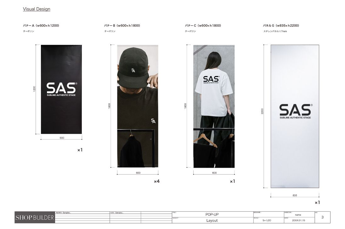 決定した平面図情報を元に、立面図を作成します。立面図でビジュアルのサイズもご提案します。あわせて、ビジュアルの印刷データをご支給ください。