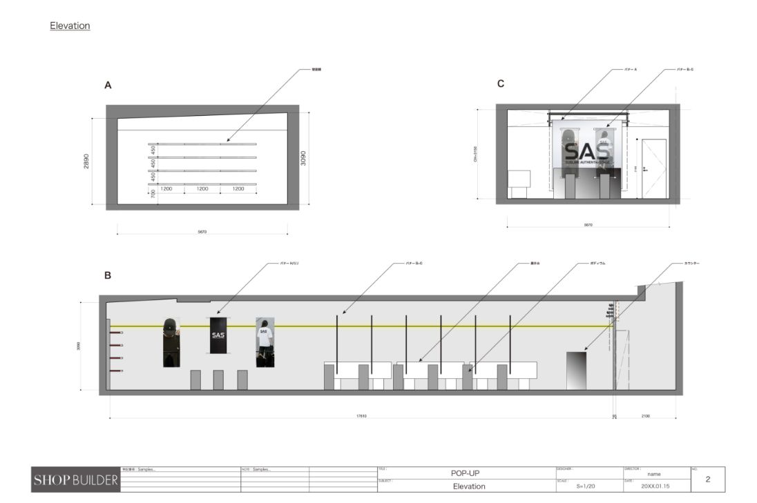 立面図作成平面図をベースに、外観や高さのわかる立面図を作成します。各什器や造作物の高さをご確認いただきます。