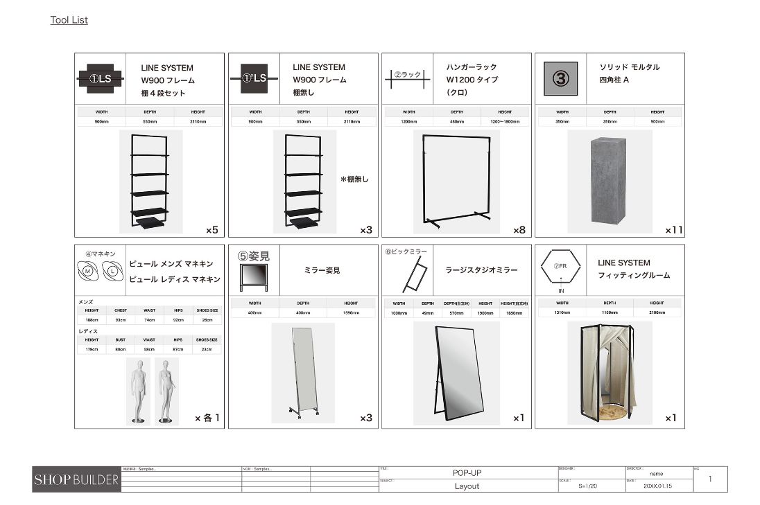 什器セレクトポップアップ内容をヒアリング後、会場の図面のご提供をお願いしております。ディスプレイする商品数やカテゴリーにあわせて、什器の選定とレイアウトをおこないます。