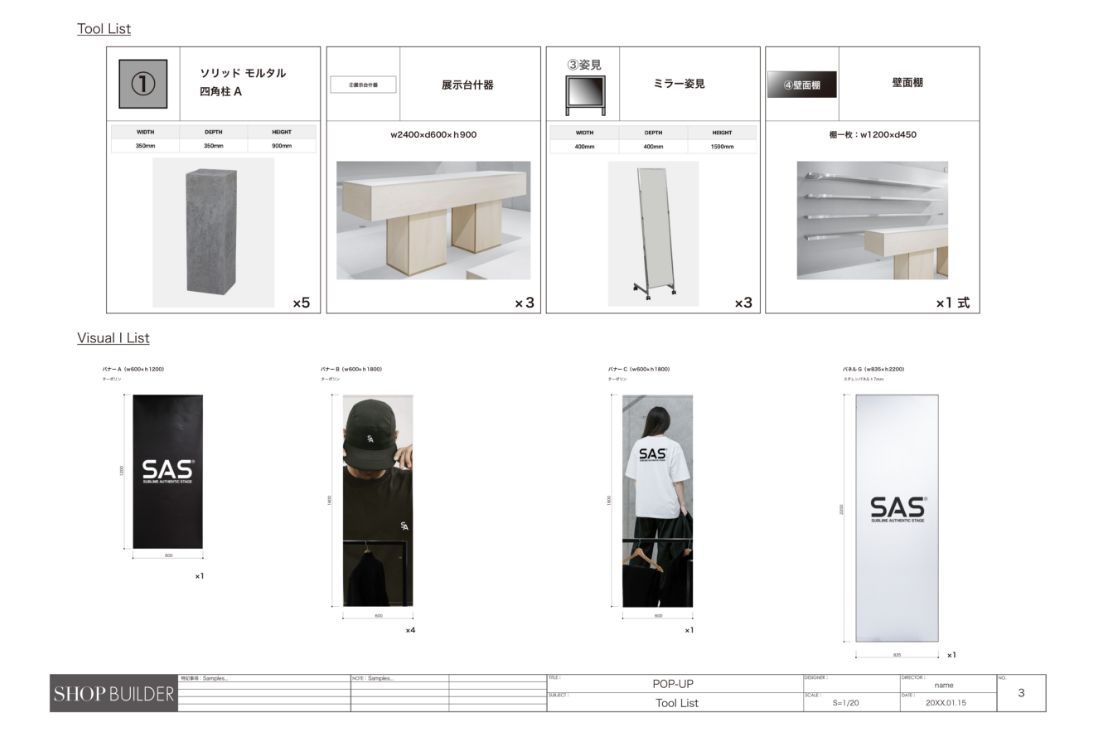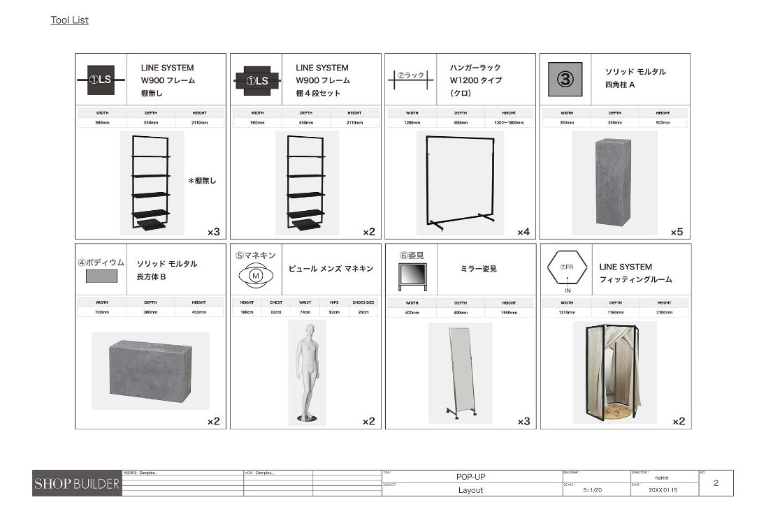 什器セレクトポップアップ内容をヒアリング後、会場の図面のご提供をお願いしております。ディスプレイする商品数やカテゴリーにあわせて、什器の選定をおこないます。