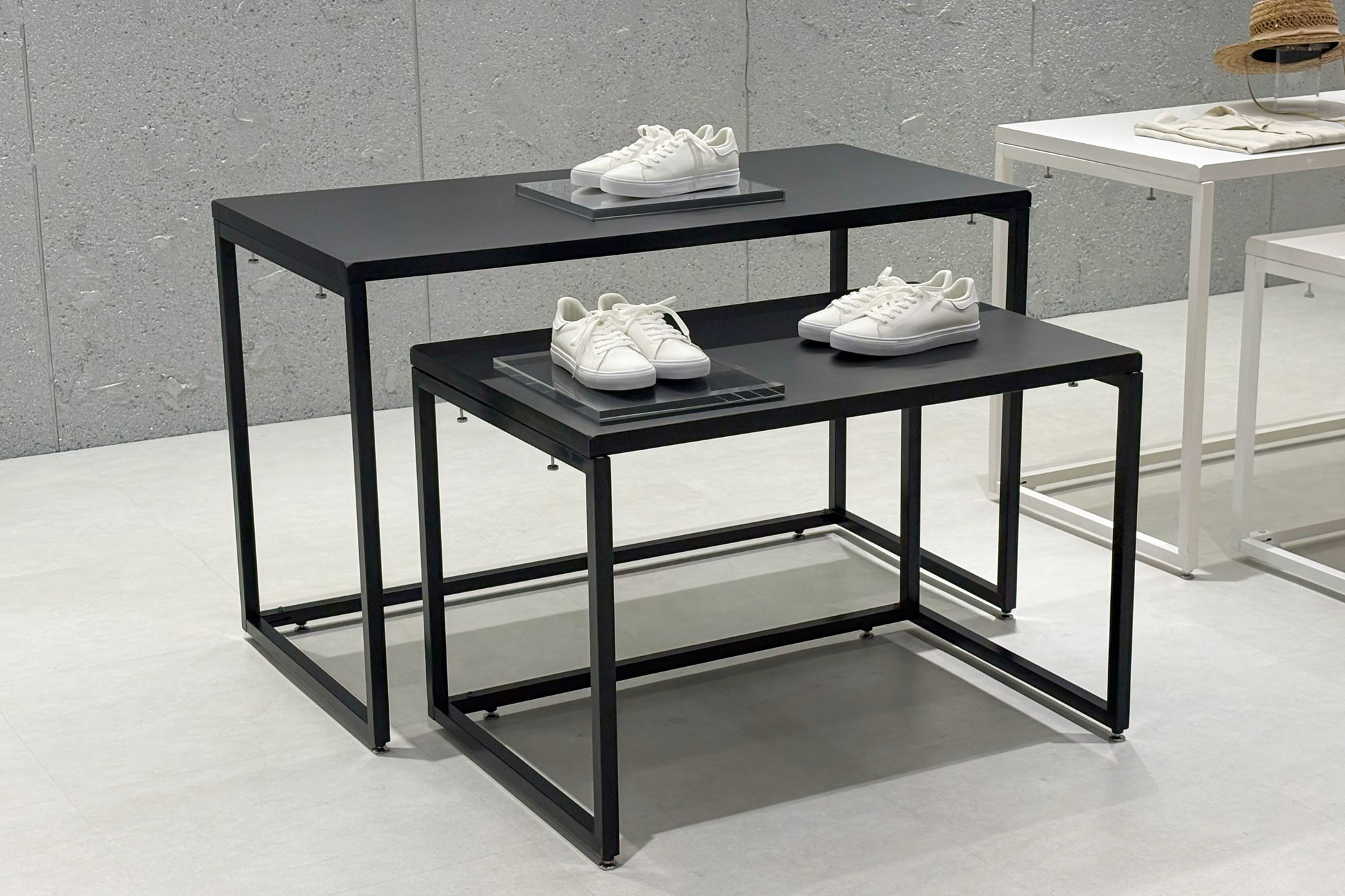 フレーム脚/天板ともにブラックで仕上げたテーブルは、スタイリッシュなフォルムで、商品を引き立てて魅せます。