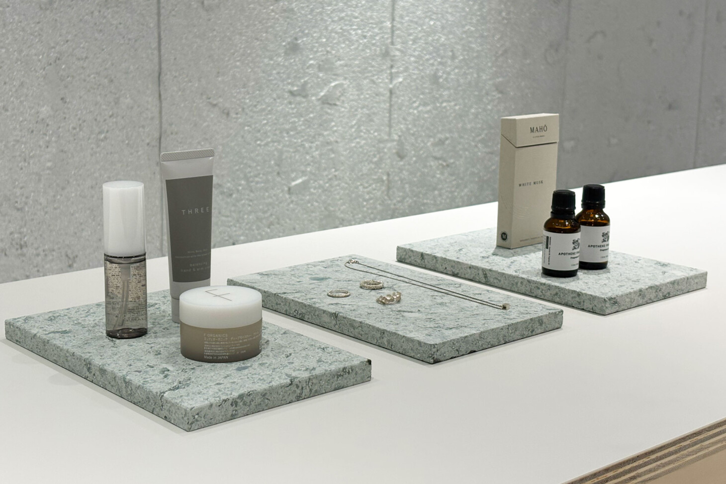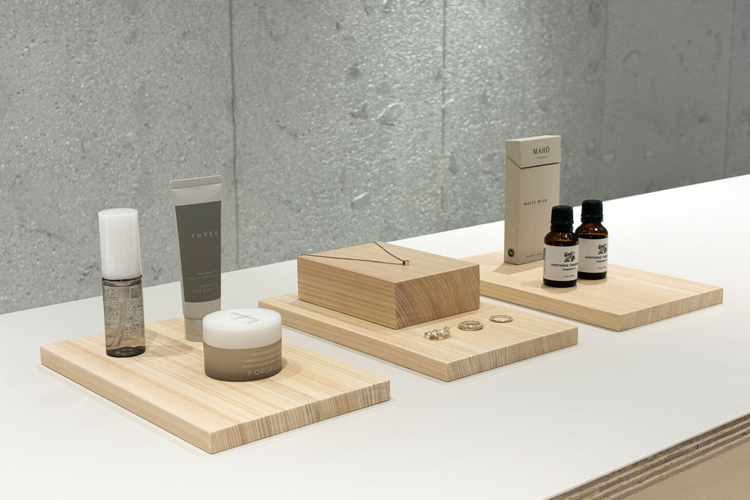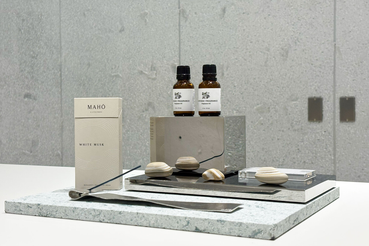 お香やアロマオイルなどを、異素材の組み合わせで展示した使用例です。
