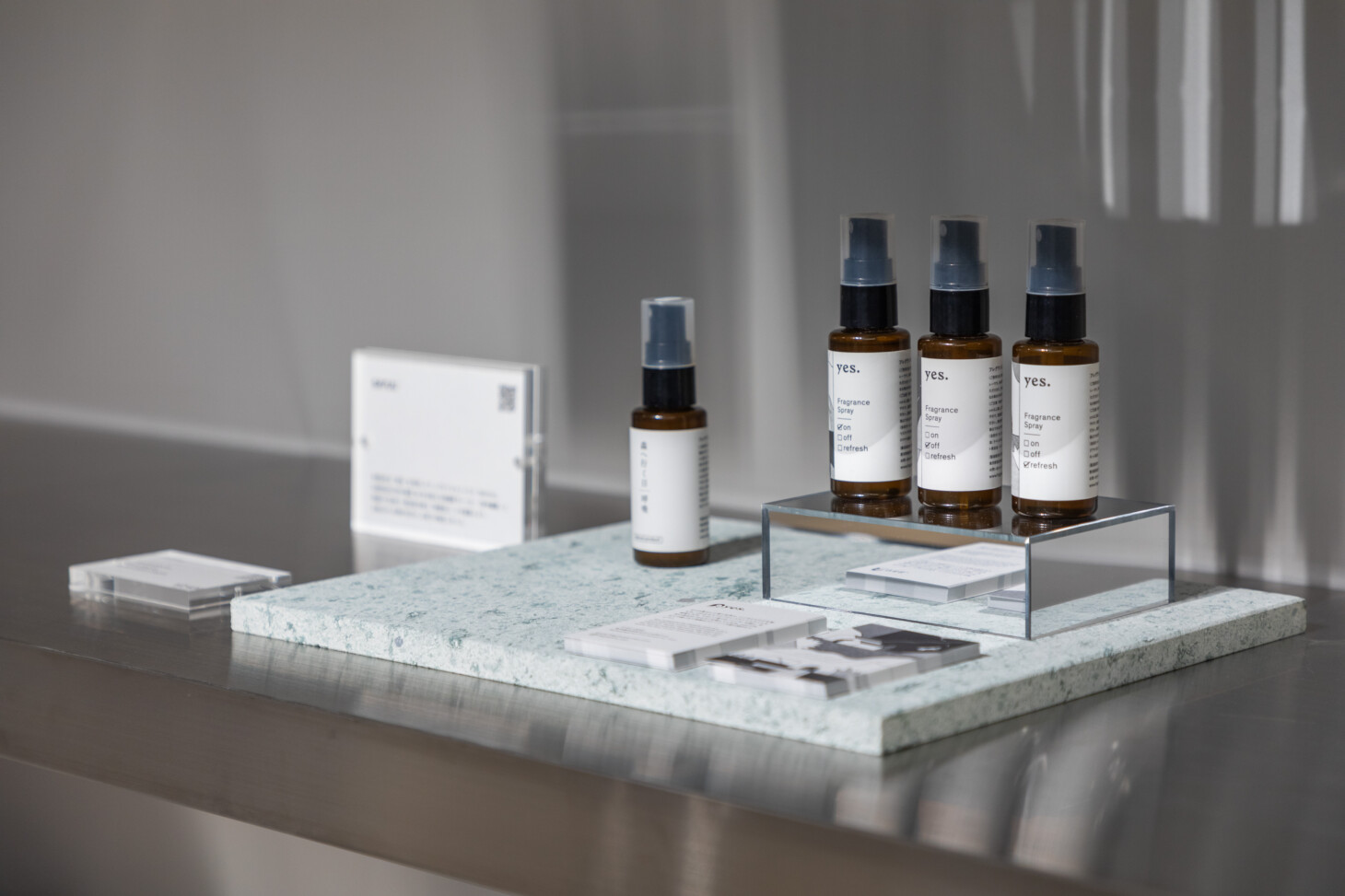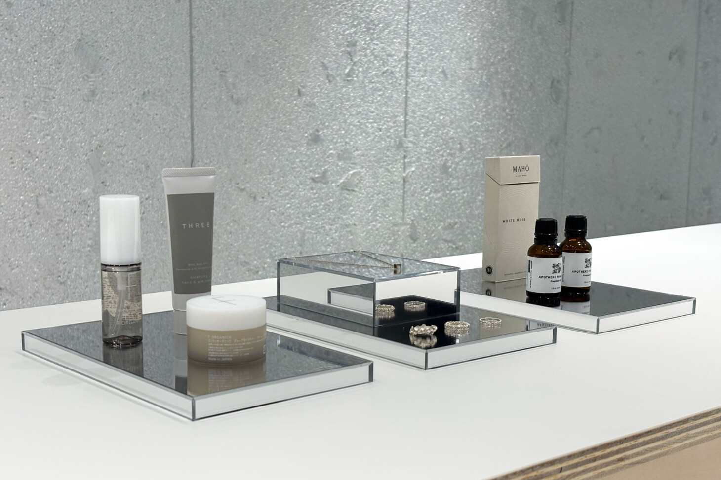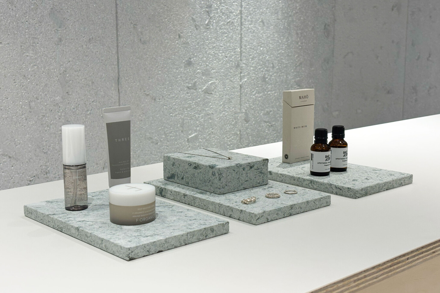 お香やアロマオイルなどを、異素材の組み合わせで展示した使用例です。