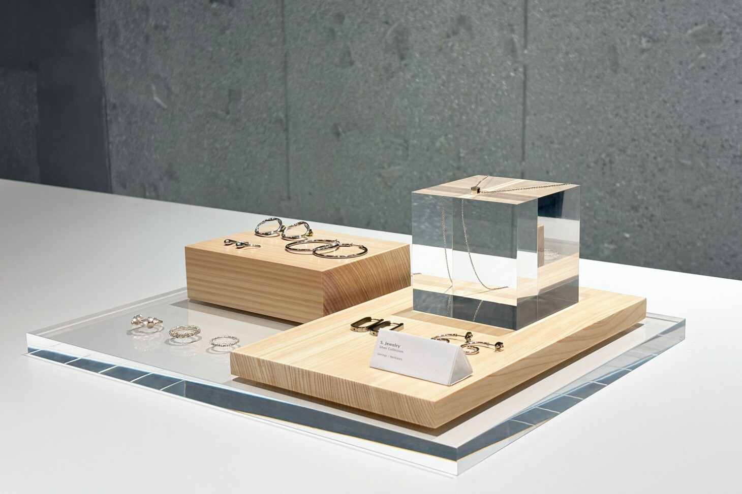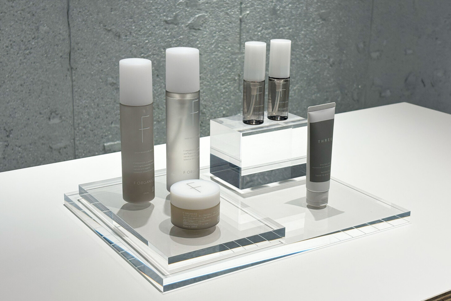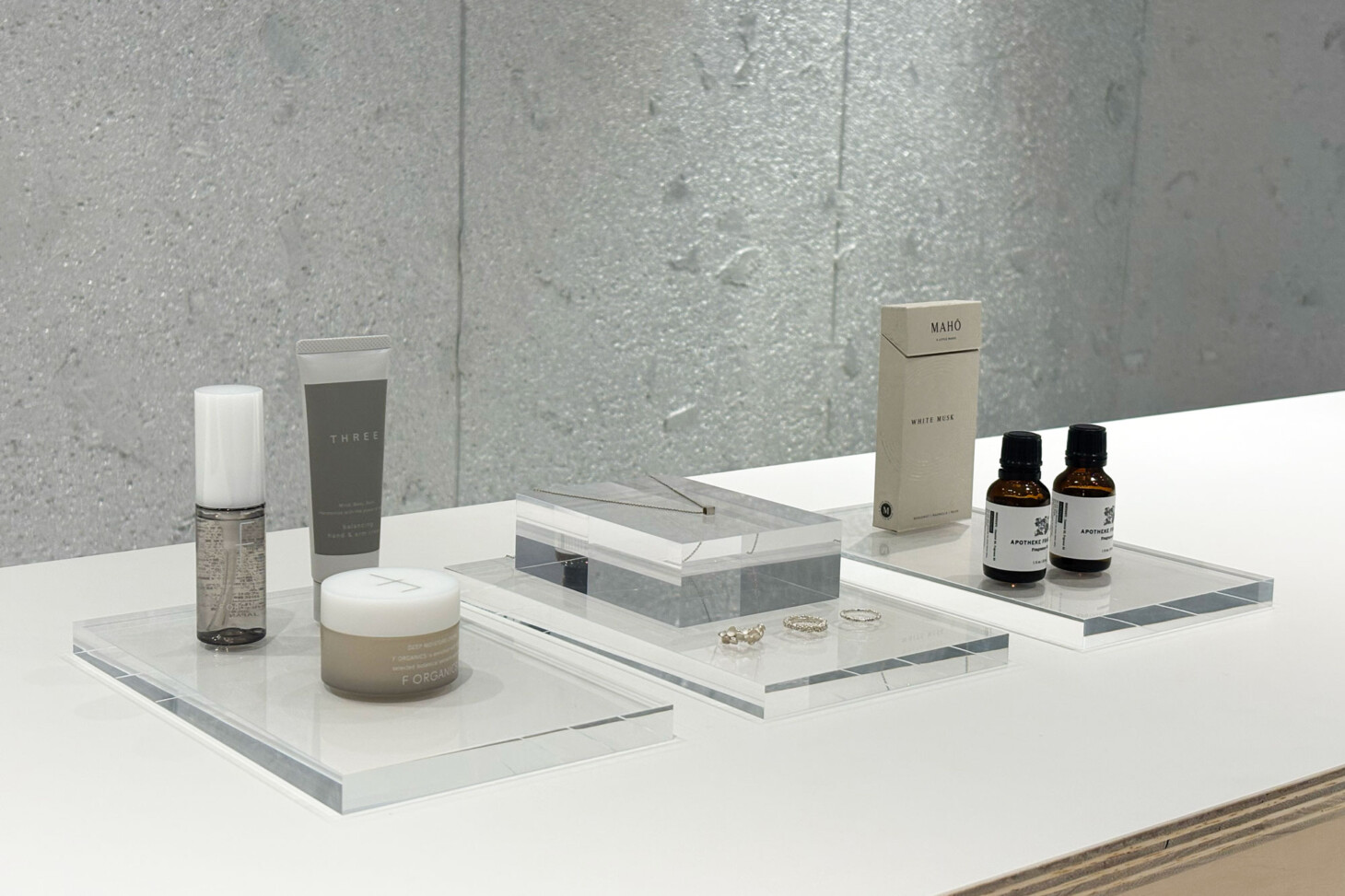 透き通るガラスのようにクリアで繊細な素材で、どんな商品とも相性がよいアクリル。清潔感があり、商品の繊細さや美しさを引き立てます。厚みのあるアクリルのため、上質感の演出と共に、商品が浮遊しているような魅せ方で、空間に透け感を与えます。光の屈折や影の落ち方にひとクセあり、たくさん並べても陳列空間が退屈な印象になりません。