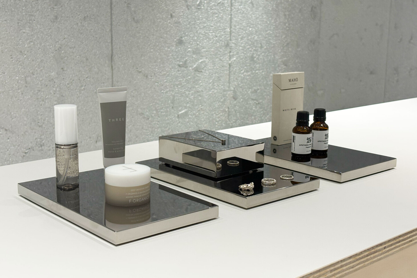 無機質な素材感がモダンな印象のステンレス。鏡面仕上げのため美しい金属光沢を放ち、表面は商品を幽玄に反射させます。金属特有の高級感と重厚感で、商品と空間にスタイリッシュで洗練された印象を与えます。
