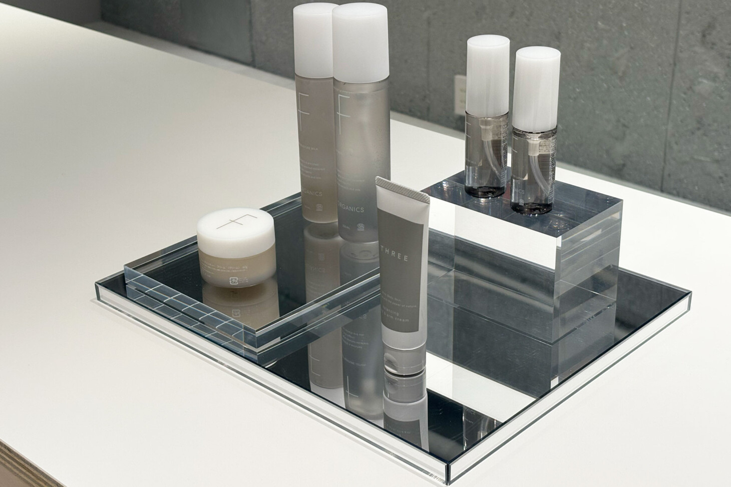 鏡面加工を施したミラータイプのアクリル。表面はまるで鏡のように光を反射し、商品の映り込みにより、奥行き・立体感が生まれます。高級感や視覚的なインパクトを演出し、重厚感のあるステンレスよりも、軽やかで抜け感のある印象を与えます。