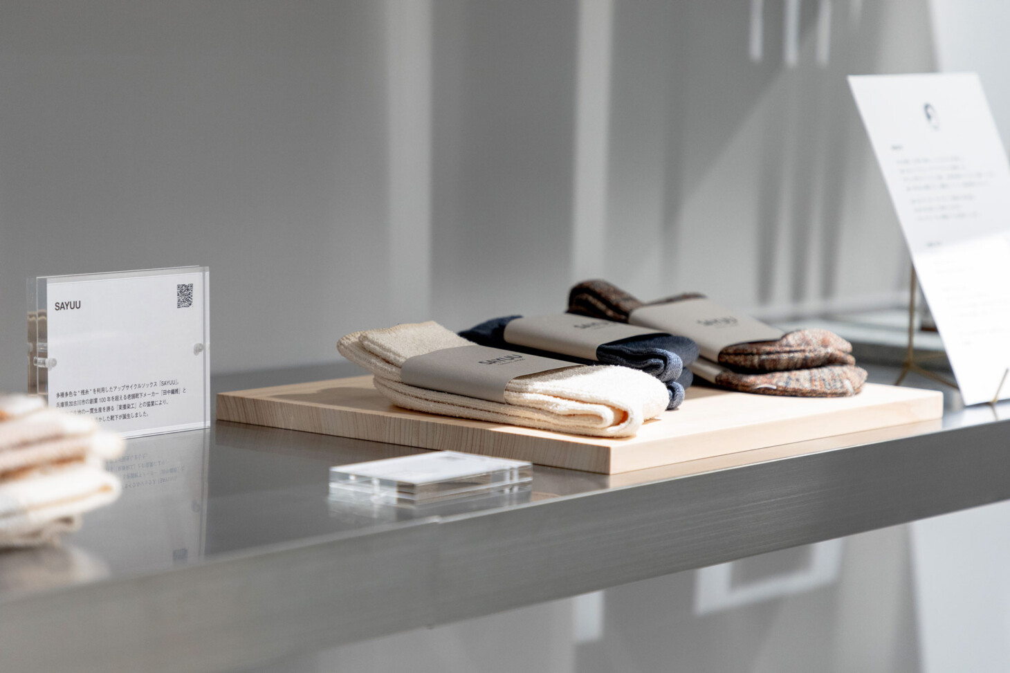 木(ヒノキ)の自然のあたたかみを活かし、オーガニックコットンの小物や、書籍などの展示にもご活用いただけます。