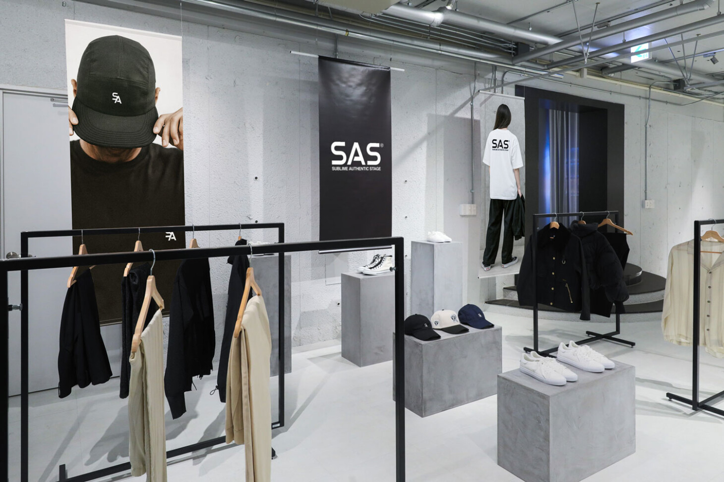 それにプラスして、ブロック型のポディウム什器を組み合わせると、空間にリズムがうまれ、よりスタイリッシュな印象になります。