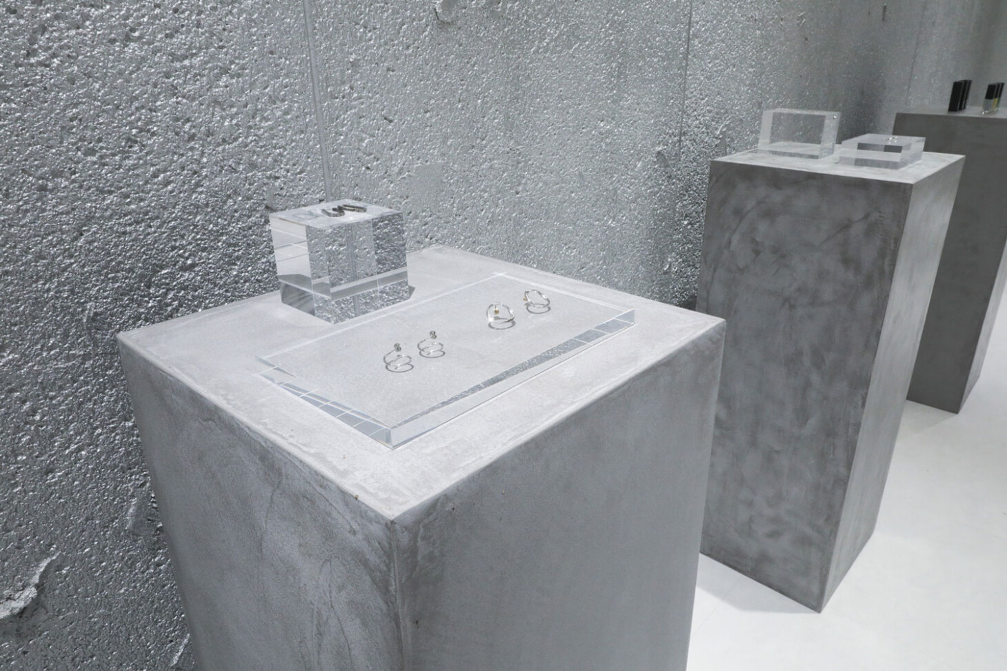 ポディウム什器は3種類の素材をご用意しており、細長い四角柱はモルタル、ブラックメタルの2種類がございます。